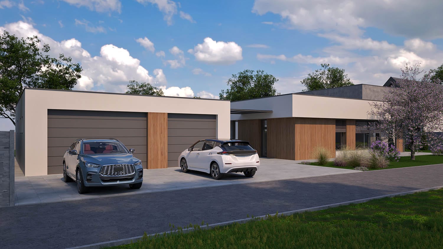 3D vizualizácia moderného domu s dvojgarážou, hnedým dreveným obkladom