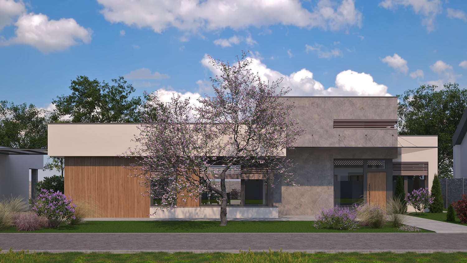 Exteriérová vizualizácia rodinného domu s betónovou stierkou, dreveným obkladom a kvitnúcim ružovým stromom pod modrou oblohou.